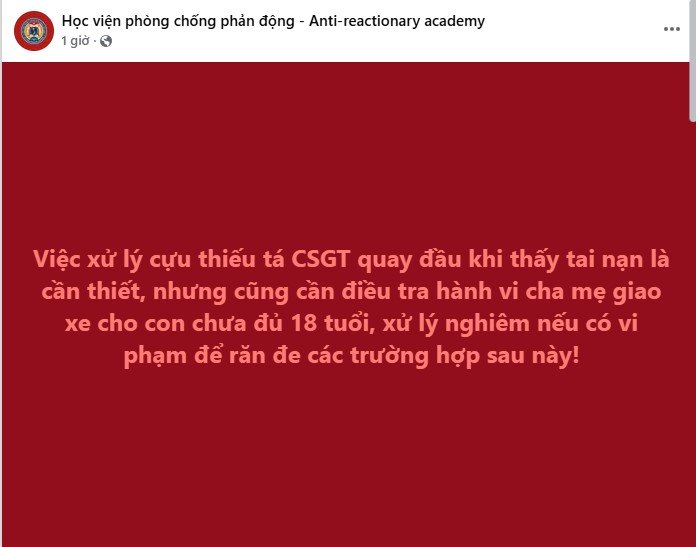 Theo Học viện phòng chống phản động (Anti-reactinonary academy), việc xử lý cựu thiếu tá CSGT quay đầu xe khi thấy tai nạn là cần thiết nhưng cũng cần điều tra hành vi cha mẹ giao xe cho con khi chưa đủ 18 tuổi để có biện pháp xử lý nghiêm minh.